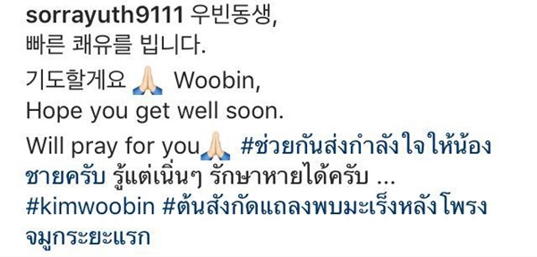 ล่าสุด (24 พฤษภาคม 2560) สรยุทธ สุทัศนะจินดา ผู้สื่อข่าวชื่อดัง ที่มีความสนิทสนมกับ คิมอูบิน ตั้งแต่สมัยพระเอกหนุ่มเคยมาออกรายการด้วย ได้โพสต์ภาพคู่ลงในอินสตาแกรม พร้อมข้อความส่งกำลังใจให้คิมอูบินว่า " Woobin, Hope you get well soon. Will pray for you #ช่วยกันส่งกำลังใจให้น้องชายครับ รู้แต่เนิ่น ๆ รักษาหายได้ครับ ... #kimwoobin #ต้นสังกัดแถลงพบมะเร็งหลังโพรงจมูกระยะแรก"
