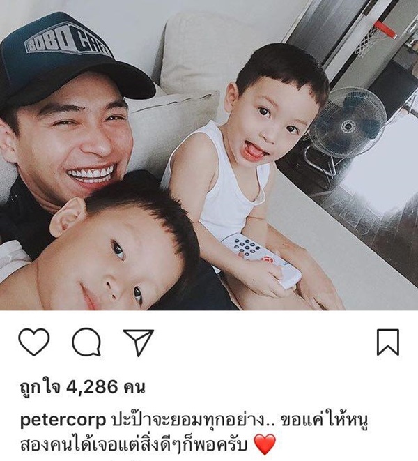 โดยปีเตอร์ ได้โพสต์ภาพคู่กับลูกชายทั้ง 2 คน พร้อมแคปชั่นจากหัวใจคนเป็นพ่อว่า "ปะป๊าจะยอมทุกอย่าง.. ขอแค่ให้หนูสองคนได้เจอแต่สิ่งดี ๆ ก็พอครับ"