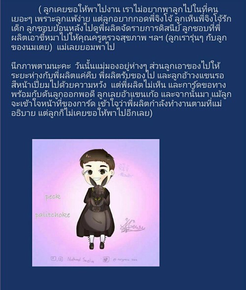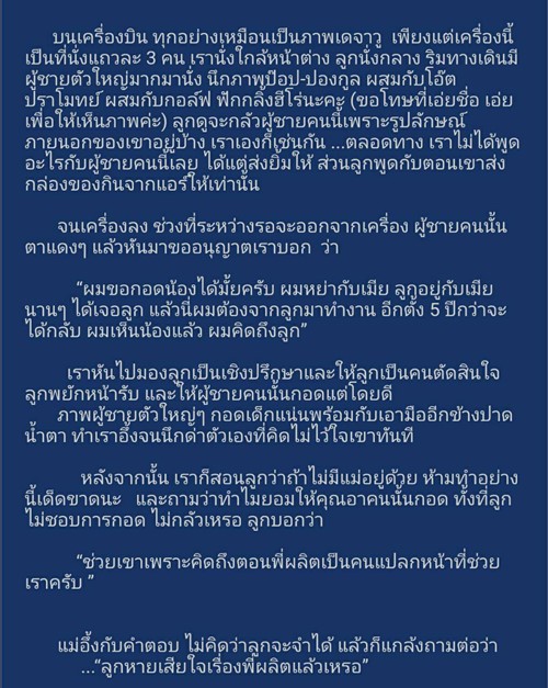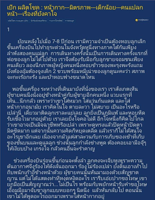 โดยคุณ ปลาด๊าว ปลาดาว เล่าว่า เมื่อ 7-8 ปีก่อน เธอกับลูกได้ขึ้นเครื่องบินไปทำธุระที่จังหวัดหนึ่งทางภาคใต้กันเพียง 2 คน แต่ต้องหอบของไปเพียบ ระหว่างเดินมาที่นั่ง ก็เห็นผู้ชายคนหนึ่งนั่งอยู่ด้านหน้า แวบแรกที่เห็นก็นึกกลัว เพราะเขาใส่แว่นกันแดด ใส่หมวก และยังมีหน้ากากอนามัยปิดปาก เธอจึงระแวงว่า เขาไม่สบาย จะมาติดลูกวัย 2 ขวบ ของเธอหรือเปล่า หรืออาจจะเป็นมิจฉาชีพ ??