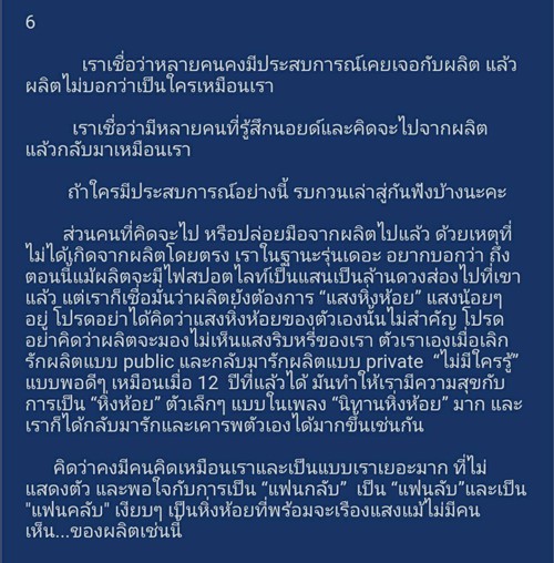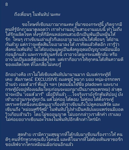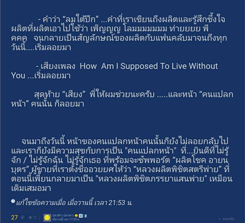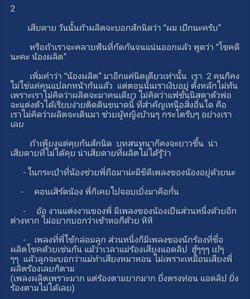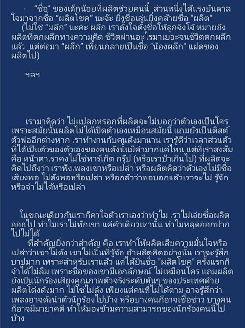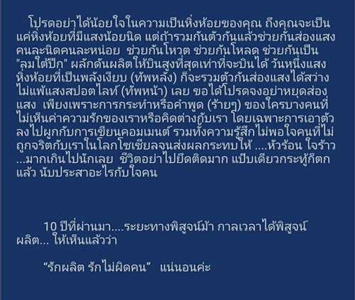 นอกจากเรื่องราวความประทับใจในครั้งนั้นแล้ว คุณ ปลาด๊าว ปลาดาว ยังได้บอกเล่าความรู้สึก ความรัก และความผูกพัน ของเธอที่มีต่อ "เป๊ก ผลิตโชค" และยืนยันกับแฟน ๆ ทุกคนว่า "10 ปีที่ผ่านมา....ระยะทางพิสูจน์ม้า กาลเวลาได้พิสูจน์ผลิต... ให้เห็นแล้วว่า "รักผลิต รักไม่ผิดคน" แน่นอนค่ะ"