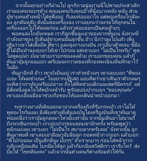 พอเครื่องลง ลูกหลับ เธอจึงตั้งใจให้คนอื่นลงไปก่อนแล้วค่อยลง พอเธอลุกขึ้นจะเอาของ ก็เห็นผู้ชายคนนั้นลุกขึ้นมา เธอชี้มือให้เขาไปก่อน แต่เขาบอก "ไม่เป็นไรครับ" และช่วยเธอยกของลง ก่อนจะมาช่วยเธอถือของลงจากเครื่อง ขณะที่เธออุ้มลูกลงมา เขาก็หันมามองว่าลงไหวไหม กระทั่งถึงรถเข็นกระเป๋า เธอขอบคุณเขาอีกครั้ง บอกว่าหนักแย่เลย แต่เขาบอกว่า "ไม่เป็นไร สบายมากครับผม"