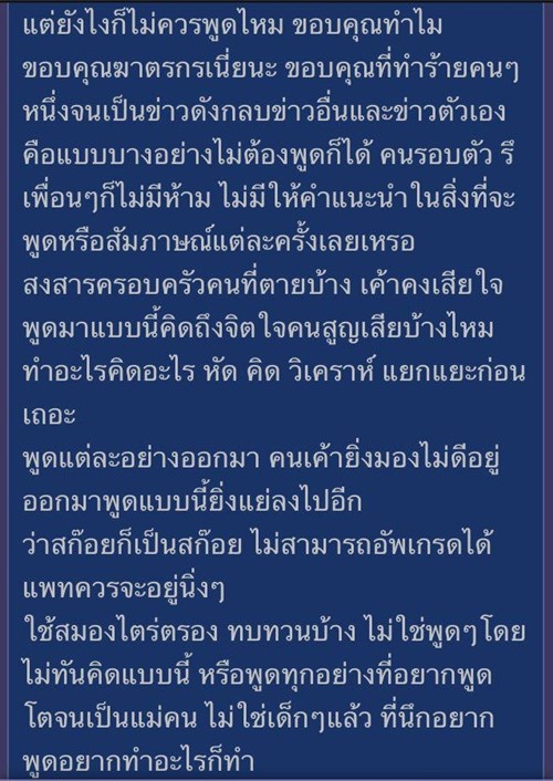 สงสารครอบครัวคนที่ตายบ้าง เค้าคงเสียใจ พูดมาแบบนี้คิดถึงจิตใจคนสูญเสียบ้างไหม ทำอะไรคิดอะไร หัด คิด วิเคราห์ แยกแยะก่อนเถอะ พูดแต่ละอย่างออกมา คนเค้ายิ่งมองไม่ดีอยู่ ออกมาพูดแบบนี้ยิ่งแย่ลงไปอีก ว่าสก๊อยก็เป็นสก๊อย ไม่สามารถอัพเกรดได้ แพทควรจะอยู่นิ่ง ๆ ใช้สมองไตร่ตรอง ทบทวนบ้าง ไม่ใช่พูด ๆ โดยไม่ทันคิดแบบนี้ หรือพูดทุกอย่างที่อยากพูด โตจนเป็นแม่คน ไม่ใช่เด็ก ๆ แล้ว ที่นึกอยากพูดอยากทำอะไรก็ทำ