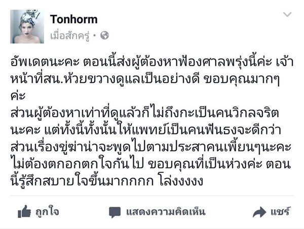 ทั้งนี้ ดีเจต้นหอม ได้แจ้งเพิ่มเติมว่า ตอนนี้ส่งผู้ต้องหาฟ้องศาลพรุ่งนี้ (8 มิถุนายน 2560) เจ้าหน้าที่ สภ.ห้วยขวาง ดูแลเป็นอย่างดี ขอบคุณมาก ๆ ค่ะ ส่วนผู้ต้องหาเท่าที่ดูแล้วก็ไม่ถึงกับเป็นคนวิกลจริตนะคะ แต่ทั้งนี้ทั้งนั้นให้แพทย์เป็นคนฟันธงจะดีกว่า ส่วนเรื่องขู่ฆ่าน่าจะพูดไปตามภาษาคนเพี้ยน ๆ นะคะ ไม่ต้องตกอกตกใจกันไป ขอบคุณที่เป็นห่วงค่ะ ตอนนี้รู้สึกสบายใจขึ้นมาก โล่ง