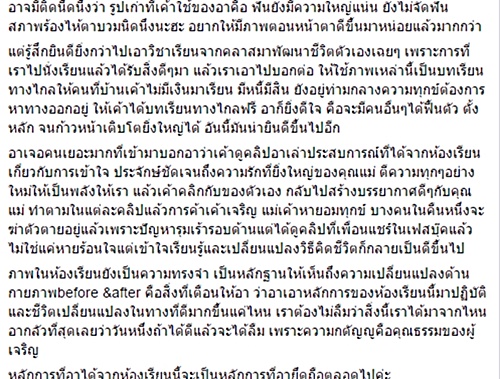 อย่างไรก็ตาม อาตุ๊ยตุ่ยเองก็บอกว่า การเข้าคอร์ส เข้าห้องเรียนของครูอ้อยนี้ได้ผลจริง ช่วยให้ตนรักพ่อแม่มากขึ้น รักษาใจในแดนบวก ได้ทำงานที่มั่นคง มีสภาพคล่องทางการเงินที่ไม่อัตคัด ดูแลพ่อแม่ได้ และได้ช่วยเหลือคนอื่นโดยที่ตนเองไม่ลำบาก