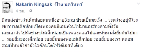 เมื่อวันที่ 22 มิถุนายน 2560 นักร้องเสียงดี...หัวใจหล่อ ป้าง นครินทร์ กิ่งศักดิ์ ได้โพสต์ภาพลงในเฟซบุ๊ก Nakarin Kingsak -ป้าง นครินทร์ ซึ่งเป็นภาพมือของเด็กน้อยกำลังชี้ไปที่โทรศัพท์มือถือ ซึ่งเปิดมิวสิควิดีโอเพลง คนมีเสน่ห์ อยู่ที่โรงพยาบาลแห่งหนึ่ง