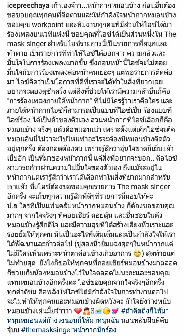นอกจากนี้ ไอซ์ ปรีชญา ยังได้ขอบคุณแฟนคลับหน้ากากหมอนข้างที่คอยเชียร์ คอยลุ้น และชื่นชอบในตัวเธอ ซึ่งช่วยเติมเต็มและเป็นกำลังใจให้พัฒนาและก้าวต่อไปด้วย