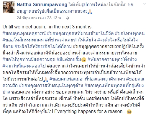 โดยแม่ชีสต๊อป ได้โพสต์ข้อความก่อนบวชว่า