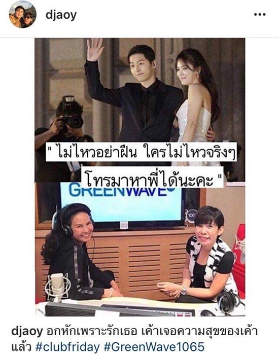 พี่อ้อย (พี่อ้อย พี่ฉอด) คลับฟรายเดย์ โพสต์ภาพ ซงจุงกิ-ซองเฮเคียว หลังประกาศแต่งงาน แซวแฟนคลับ ไม่ไหวอย่าฝืน โทร. มาหาพี่ได้นะคะ
