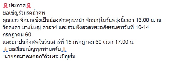 "ประกาศ ขอเชิญร่วมรดน้ำศพ คุณแวว จ๊กมก