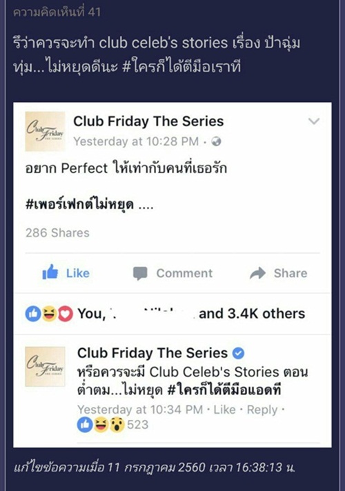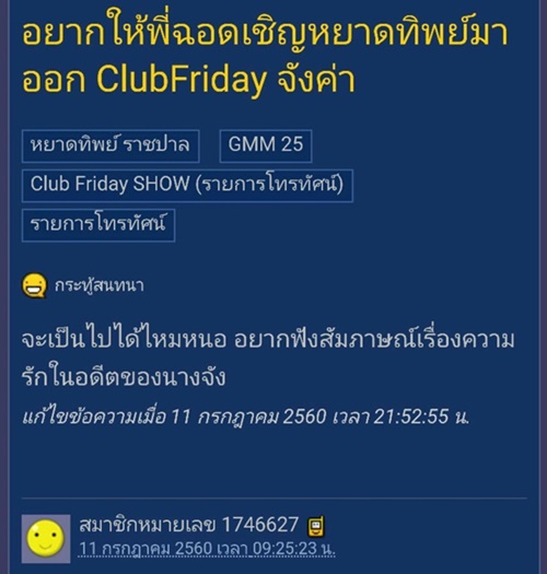 อย่างไรก็ดี ได้มีชาวโซเชียลจำนวนหนึ่ง ที่รู้สึกไม่พอใจกับท่าทีของทางรายการ ที่แสดงออกเกี่ยวกับแท็ก #ต่ำตมไม่หยุด และการนำดารามาบอกเล่าเรื่องราวความรักในอดีต จนกลายเป็นประเด็นให้คนขุดคุ้ย วิพากษ์วิจารณ์ และดราม่ากันแบบนี้ กระทั่งล่าสุด (11 กรกฎาคม 2560) ได้มีคนตั้งกระทู้ในพันทิป เปิดประเด็นว่า "อยากให้พี่ฉอดเชิญหยาดทิพย์มาออก ClubFriday จังค่า" พร้อมระบุว่า "จะเป็นไปได้ไหมหนอ อยากฟังสัมภาษณ์เรื่องความรักในอดีตของนางจัง"