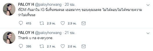 ขณะที่ก่อนหน้านี้ ทางสาว พลอย หอวัง ก็ได้โพสต์ข้อความขอบคุณแฟน ๆ ด้วยว่า "Thank u na everyone" และ "ที่ DM กันมาใน IG นี่เห็นหมดนะ เยอะมาก ๆ ขอบคุณนะคะ ไม่ได้ตอบไม่ได้หมายความว่าไม่เห็นนะ"
