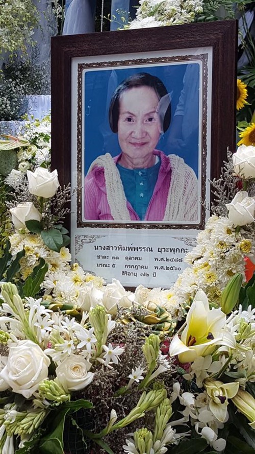 ล่าสุด (16 กรกฎาคม 2560) ได้มีพิธีฌาปนกิจป้าติ่ง พิมพ์พรรณ โดยมีคุณชูศักดิ์ สุธีรธรรม ผู้กำกับชื่อดังช่อง 3 และ สุมาลี ชาญภูมิดล ภรรยา เป็นประธานทอดผ้าบังสุกุลงานฌาปนกิจนักแสดงอาวุโส ป้าติ่ง พิมพ์พรรณ โดยมี ทาริกา ธิดาทิตย์ แห่งค่ายมาสเตอร์ วัน เป็นเจ้าภาพ