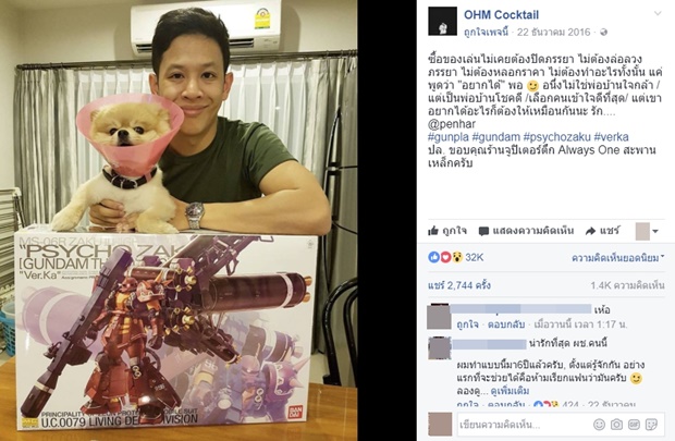 โดยเจ้าตัวโพสต์ภาพคู่กับของเล่นพร้อมทั้งเขียนบรรยายชมภรรยาคนสวยว่า ตนซื้อของเล่น คือหุ่นยนต์กันดั้ม แต่ตนไม่ต้องปิดหรือหลอกล่อภรรยา แค่พูดว่าอยากได้ก็พอ ตนไม่ใช่พ่อบ้านใจกล้าแต่เป็นพ่อบ้านที่โชคดีมากกว่าที่เลือกคนเข้าใจ