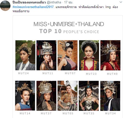 กำลังเป็นที่พูดถึงกันเลยทีเดียว สำหรับ เวทีการประกวด Miss Universe Thailand ที่ตอนนี้เหล่าสาวงามกำลังไปทำกิจกรรม เก็บตัวอยู่ที่จังหวัดเชียงใหม่ และล่าสุด (25 กรกฎาคม 2560) ทางกองประกวดได้เปิดเผยผลคะแนนโหวตสูงสุด 10 คนสุดท้าย ของตำแหน่ง People\'s Choice ออกมาให้แฟนสาวงามได้ทราบผลกันแล้ว ได้แก่ หมายเลข 24, 11, 07, 23, 40, 14, 37, 05, 35, 34 ซึ่งตำแหน่งนี้ มีเพียง 1 คนเท่านั้น ที่มีสิทธิ์เข้ารอบ 16 คนสุดท้ายเป็นคนแรก