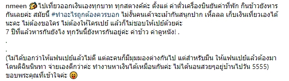 ล่าสุด (1 สิงหาคม 2560) สาวมีน คงสุดจะทน ขอโพสต์ชี้แจงชัด ๆ ลงในอินสตาแกรมว่า ไปเที่ยวออกเงินเองทุกบาท ทุกสตางค์ค่ะ ตั้งแต่ค่าตั๋วเครื่องบินยันค่าที่พัก กินข้าวยังหารกันเลยค่ะ สมัยนี้ทำอะไรถูกต้องควรบอกไม่งั้นคนเค้าจะเม้าท์กันสนุกปาก เก็บเงินเที่ยวเองได้นะคะ ไม่ต้องขอใคร ไม่ต้องให้ใครเปย์ แล้วก็ไม่ชอบให้เปย์ด้วยค่ะ 7 ปีที่แล้วหารกันยังไง ทุกวันนี้ยังหารกันอยู่ค่ะ ค่าข้าว ค่าดูหนัง ไม่ได้บอกว่าให้แฟนเปย์แล้วไม่ดี แต่ละคนก็มีมุมมองต่างกันไป แต่สำหรับมีนให้แฟนเปย์แล้วต้องมาโดนติฉินนินทา จ่ายเองดีกว่าค่ะ ทำงานหาเงินได้เหมือนกันค่ะ ไม่ได้นอนสวย ๆ อยู่บ้านไปวัน ๆ ขอบพระคุณที่เข้าใจค่ะ