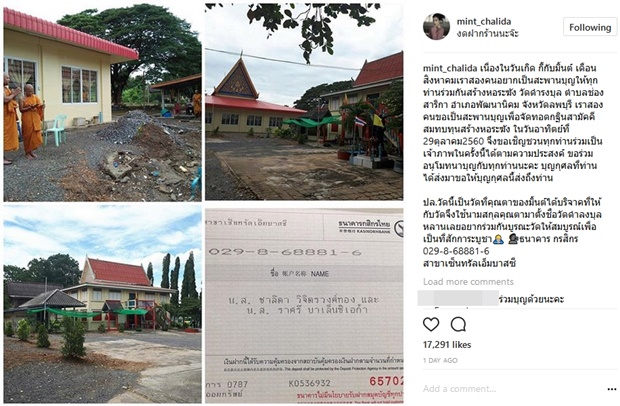 ซึ่งวันเกิดในปีนี้สาวมิ้นต์ยังได้ชวนเพื่อน ๆ และแฟนคลับมาร่วมกันทำบุญทอดกฐินสามัคคีสร้างหอระฆังให้กับวัดในจังหวัดลพบุรี โดยสาวมิ้นต์และสาวมาร์กี้ที่เกิดเดือนเดียวกันเป็นประธาน เรียกได้ว่าเป็นการทำบุญที่มีความสุข เพราะได้ทำร่วมกับคนที่เรารักนั่นเอง