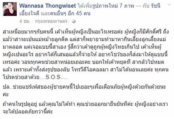 ทั้งนี้ ษา วรรณษา เล่าว่า รู้สึกเหนื่อยมากกับคนคนนี้ เขาดูถูกผู้หญิงไทยเกินไป ผู้หญิงก็มีศักดิ์ศรี แต่เขากลับมาเสนอเงิน โชว์ของลับส่งให้แบบนี้ วอนทุกคนช่วยเธอด้วย บอกให้เขาหยุดที เธอกลัวไปหมดแล้ว นอกจากส่งรูปแล้วอีกฝ่ายยังโทร. วิดีโอคอลมาด้วย ขอให้ทุกคนช่วยกันเตือนภัย และหากคนในรูปถูกแอบอ้าง ก็ขอให้ช่วยออกมายืนยันตัวตนด้วย
