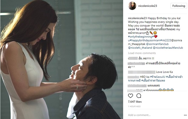 ทางด้านหวานใจคนสวยอย่างสาวนิโคล เทริโอ ก็ได้ลงรูปคู่หวาน ๆ อวยพรวันเกิดหวานใจ พร้อมกับเผยข้อความว่า ขอให้ศรรามมีแต่ความสุขตลอดไป และมีแต่รอยยิ้มอย่างนี้ทุกวัน พร้อมกับภาพส่งสายตาหวานให้กัน เหมือนจะตอกย้ำให้เห็นถึงความรักที่มากขึ้นในใจ