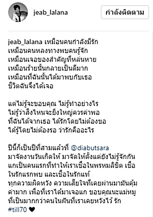 มาจัดงานวันเกิดให้ มาจัดให้ตั้งแต่ยังไม่รู้จักกัน แกเป็นคนแรกที่ทำให้เราเชื่อในพรหมลิขิต เชื่อในรักแรกพบ และเชื่อในรักแท้ ทุกความผิดหวัง ความเสียใจที่เคยผ่านมามันคุ้มค่ามาก เพื่อที่เราได้มาเจอแก ขอบคุณนะแม่หมูที่เป็นมากกว่าคนในฝันที่เราเคยหวังไว้ รัก"