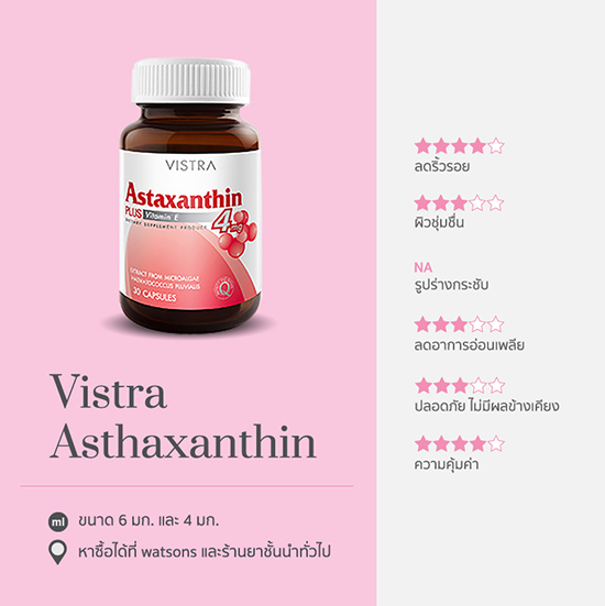 ตัว Vistra Asthaxanthin จะไม่ได้มุ่งเน้นในเรื่องของความขาวแต่เน้นให้ผิวเรามีสุขภาพที่แข็งแรง รวมถึงสุขภาพโดยรวมด้วยนะ สาว ๆ คนไหนที่มักจะปวดเนื้อ เมื่อยตัวหลังออกกำลังกาย ทานตัวนี้เข้าไปอาการเหล่านั้นจะน้อยลงเยอะเลยค่ะ เพราะช่วยให้ร่างกายฟื้นตัวเร็ว หวัดก็ไม่ค่อยถามหา นอกจากนี้ยังช่วยบำรุง หัวใจ สมอง และข้อต่อด้วย บอกได้เลยว่าครบเครื่องจริง ๆ