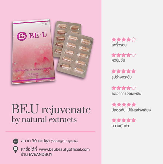 อาหารเสริม BE.U ไม่ได้ทำเพียงแค่ชะลอวัยเท่านั้นนะคะ แต่ยังเน้นเรื่องการดูแลสุขภาพด้วย เรียกได้เลยว่าเป็นอาหารเสริมที่ถูกคัดสรรและวิจัยมาอย่างดีเพื่อสาว ๆ จริง ๆ เพราะ BE.U จะเข้าไปช่วยลดริ้วรอยบนใบหน้า ให้การผลัดเซลล์ผิวเป็นไปอย่างเป็นธรรมชาติ ลดการทำงานของเม็ดสี พวกจุดด่างดำ กระ ฝ้าก็จางลงด้วย แถมยังช่วยสร้างเกราะป้องกันผิว ให้ผิวแข็งแรง ให้ผิวพรรณดูสวยสุขภาพดี แข็งแรง ชุ่มชื้นขึ้น สีผิวสม่ำเสมอ โดนแดดก็ไม่คล้ำเสียง่าย นอกจากนี้ยังช่วยให้เรามีรูปร่างที่กระชับขึ้น เพราะจะเข้าไปช่วยบำรุงให้ตับขับสารพิษตกค้าง ช่วย Detox ทำให้ระบบเผาผลาญดีขึ้น ยิ่งทานควบคู่กับการออกกำลังไปด้วย จะเห็นผลไวมากค่ะ สาว ๆ Kapook ทานแล้วเอวลดลงไป 2 นิ้ว กระชับขึ้นอย่างเห็นได้ชัด ตัวนี้เขามีสารสกัดที่ช่วยบำรุงตับและไตด้วยนะคะ ทานต่อเนื่องได้ ไม่เป็นอันตราย แต่ยังสามารถ ทานต่อเนื่องเพื่อดูแลสุขภาพได้ด้วยค่ะ ราคาไม่แพงด้วย แนะนำเลยค่ะ