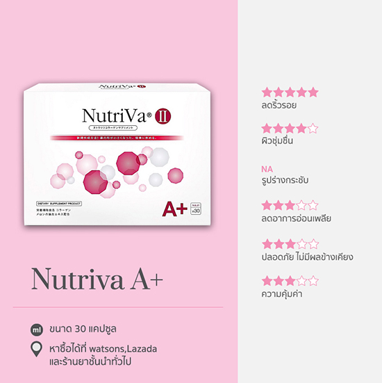 สำหรับ Nutriva A+ จะเน้นการทำงานของสาร SOD (Superoxide Dismutase) เพื่อช่วยต้านความเสื่อมของผิวและปกป้องผิวจากรังสี UV จากแสงแดด โดยธรรมชาติแล้ว ร่างกายของคนเราสามารถผลิตสาร SOD ตัวนี้ขึ้นมาได้เอง แต่เมื่อเรามีอายุที่เพิ่มขึ้น ประสิทธิภาพในการผลิตสาร SOD ของร่างกายเรานั้น ย่อมลดลงตามไปด้วยค่ะ