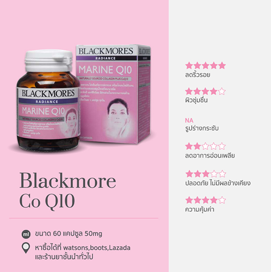มาที่ตัว Blackmore Co Q10 กันต่อค่ะ ตัวนี้จะมีส่วนประกอบหลักจากปลาทะเล Co Q10 วิตามินอี และเปลือกสนฝรั่งเศส ตัวนี้ค่อนข้างได้รับความนิยมจากหลาย ๆ คนเลยค่ะ เพราะว่าตัวนี้จะมีคุณสมบัติหลัก ๆ เลยก็คือ ลดริ้วรอยบนใบหน้า ต่อต้านอนุมูลอิสระ และมีความปลอดภัยสูง นอกจากนี้ยังช่วยให้ผิวแข็งแรงมีสุขภาพดี ชุ่มชื้น มีความยืดหยุ่น ไม่แห้ง โดยรวมแล้วผลลัพธ์ค่อนข้างดีเลยทีเดียว แต่มีข้อเสียอยู่นิดนึง นั่นก็คือขนาดของแคปซูลมีที่ใหญ่ จึงทำให้กลืนค่อนข้างยากค่ะ