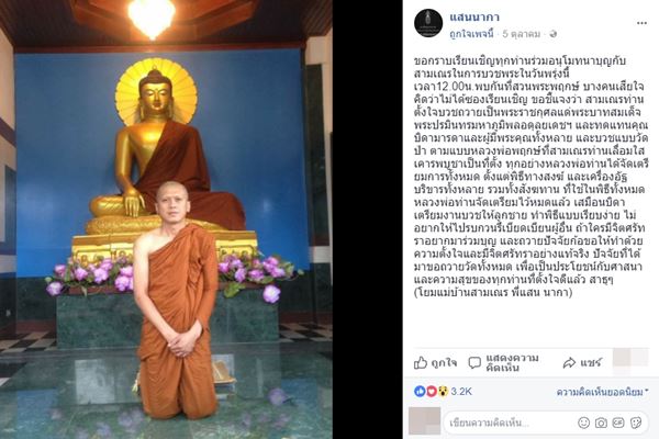 โดยล่าสุด (7 ตุลาคม 2560) เสก โลโซ ได้โพสต์ภาพและข้อความผ่านทางเฟซบุ๊กว่า หลวงพี่แสน นากา บวชเป็นพระแล้วเด้อ แต่งานนี้หนุ่มเสกไม่ได้ไปร่วมงานอุปสมบทดังกล่าว แต่ได้ส่งทีมงานโลโซไปเป็นตัวแทน