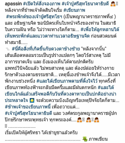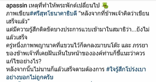 โดย เอ พศิน ได้เล่าถึงเหตุการณ์ชวนอัศจรรย์ใจที่เกิดขึ้นระหว่างวาดภาพนี้ว่า เขาได้ตัดสินใจเริ่มเขียนภาพพระพักตร์ของ เจ้าปู่ศรีสุทโธ และอธิษฐานจิต ขอนิมิตเห็นใบหน้าจริงของท่าน ในสมาธิ ในความฝัน หรือไม่ว่าจะทางใดก็ตาม เพื่อให้ลูกหลานได้เห็นพระพักตร์และแววตาท่านเวลาอธิษฐานจิต ก่อนสวดมนต์ ทำสมาธิ