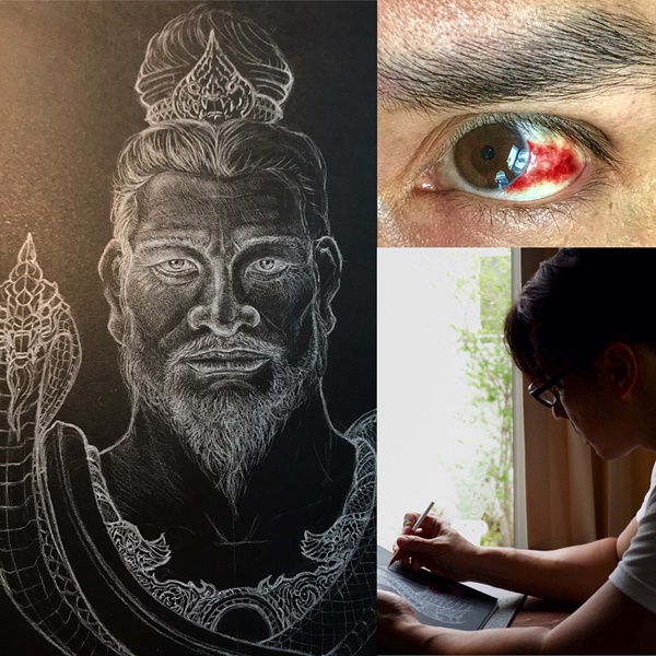 สิ่งที่เกิดขึ้นกับดวงตาข้างซ้ายของเขาหลังจากนั้น มีเส้นเลือดหลอมรวมเป็นรูปร่างแปลก ๆ โดยไร้สาเหตุ ไม่มีอาการบาดเจ็บ ยังมองเห็นได้ตามปกติ แพทย์ก็ไม่พบสาเหตุ ต้องปล่อยให้ร่างกายรักษาตัวเองตามธรรมชาติ ทำให้เขามีเวลาพักงานช่วงหนึ่ง และได้วาดภาพตามที่ตั้งใจไว้ ทุกครั้งที่วาดภาพ ท้องฟ้าจะมืดครึ้มและมีฝนตกหนัก