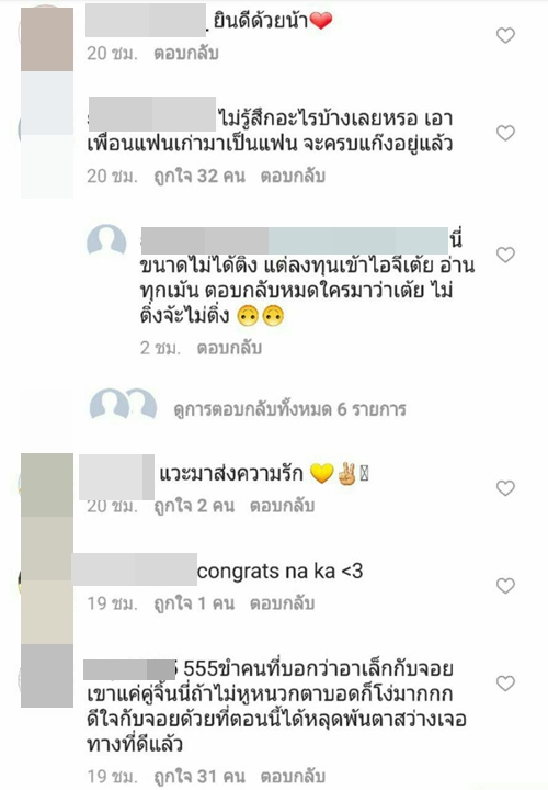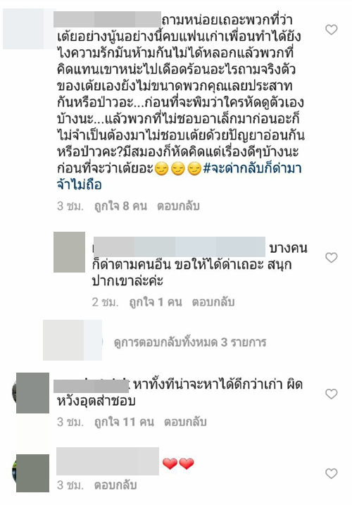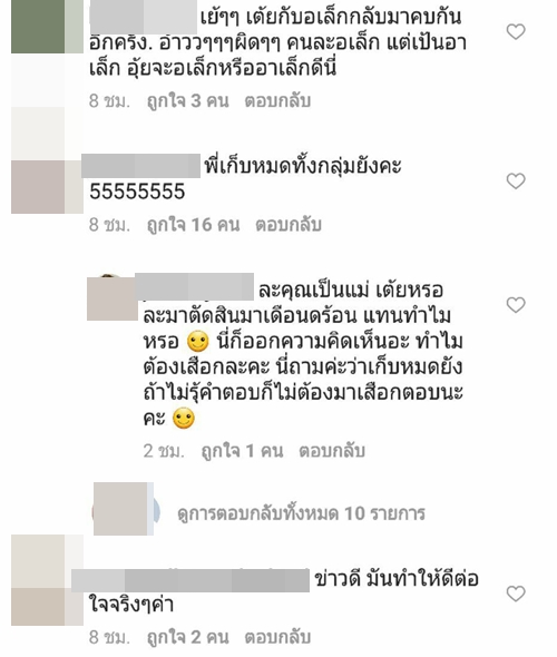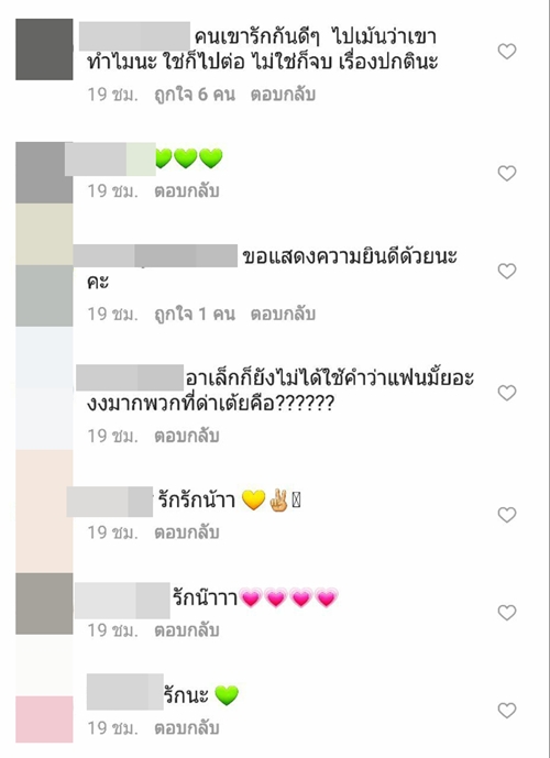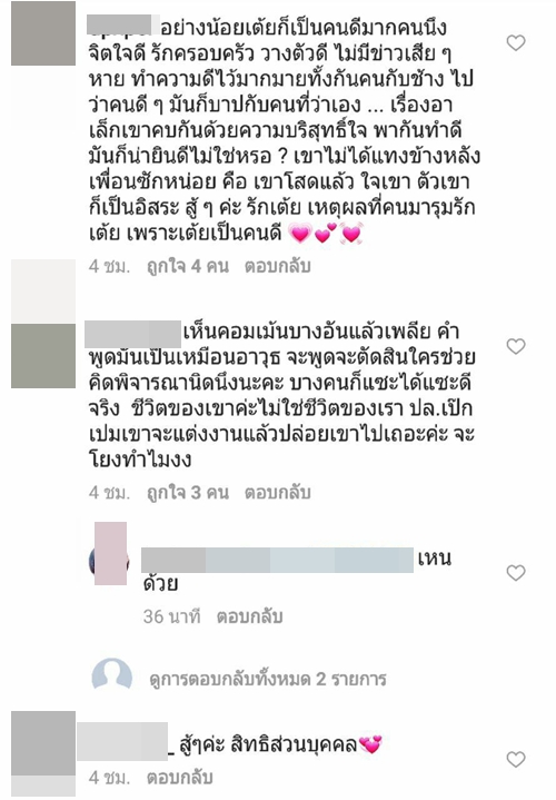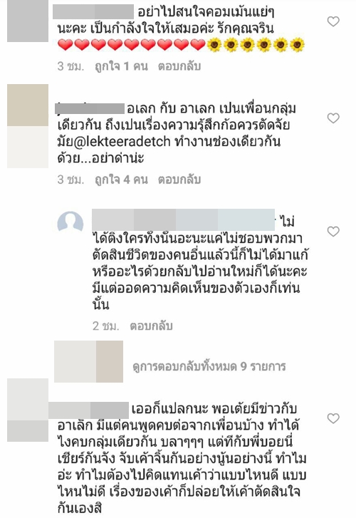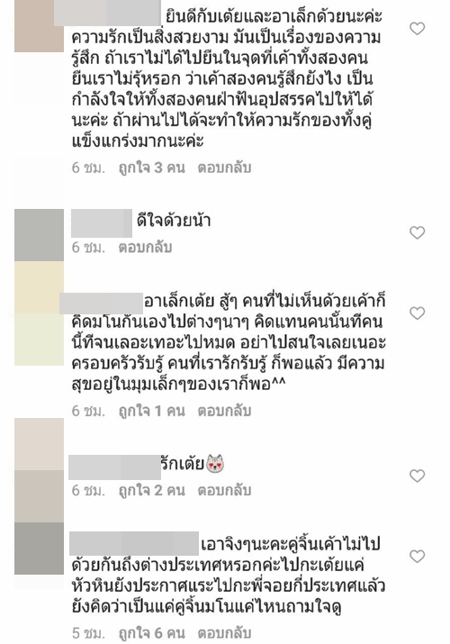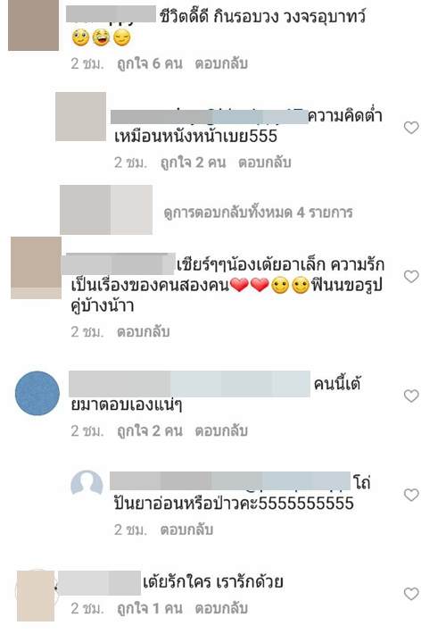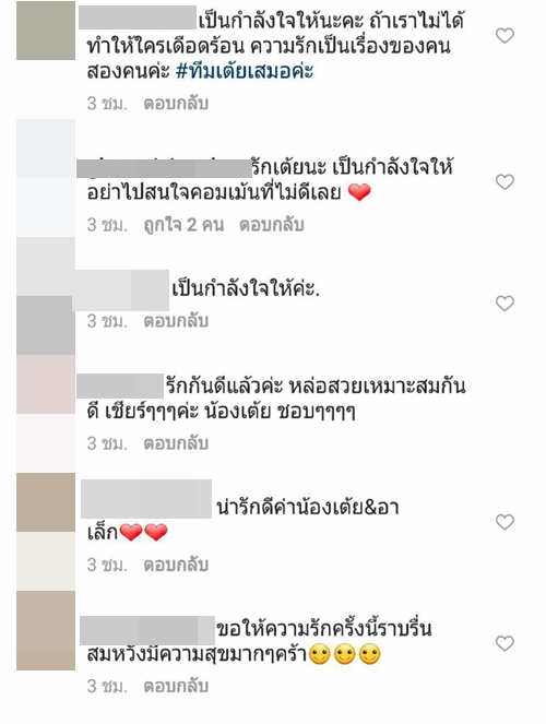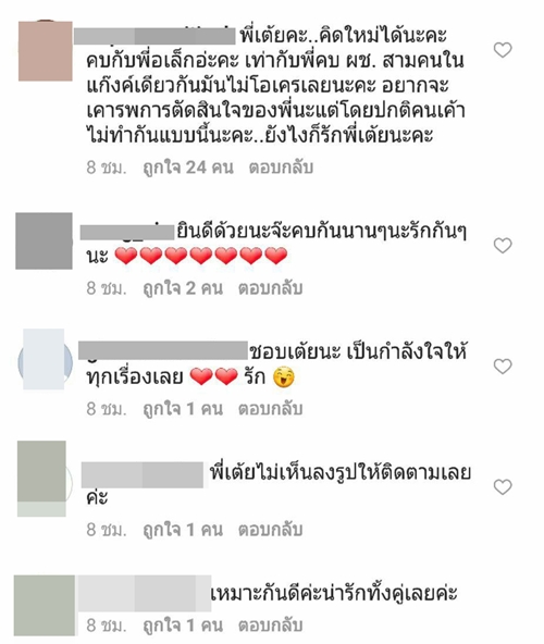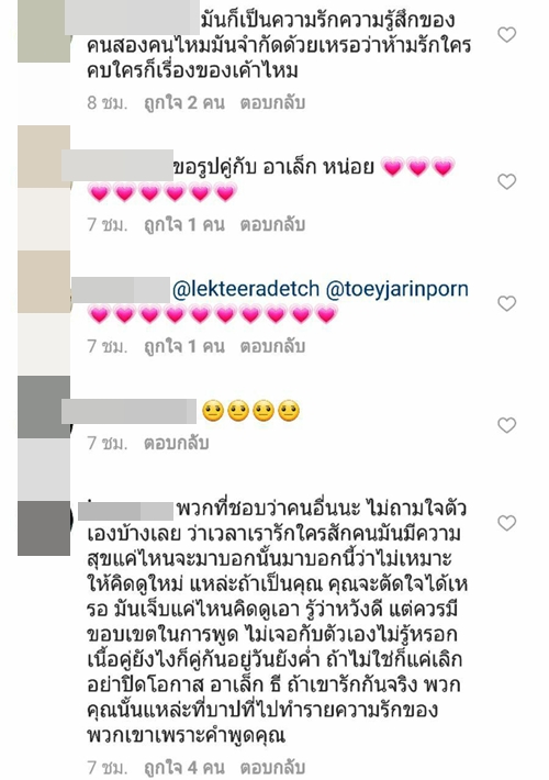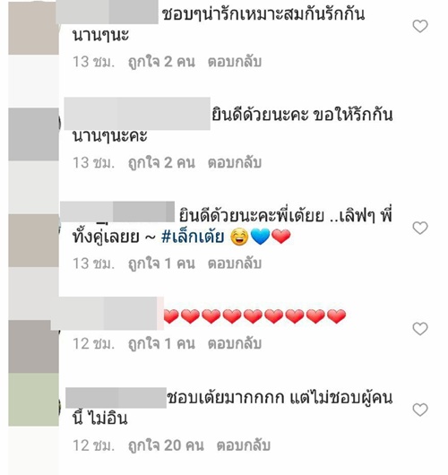 ทั้งนี้เมื่อไปส่องใน IG ของสาว เต้ย จรินทร์พร ก็พบว่า มีชาว IG เข้าไปคอมเมนต์กันอย่างล้นหลาม ทั้งแฟนคลับที่ร่วมยินดีในความรักครั้งใหม่ และกลุ่มคนที่มาดราม่า บอกว่าไม่อยากให้เธอคบกับ อาเล็ก ธีรเดช