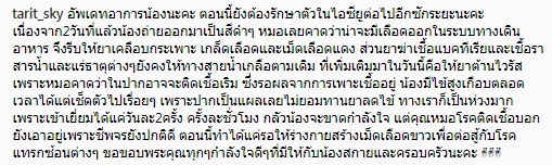 ล่าสุด (20 ตุลาคม 2560) คุณแม่น้องสกาย ได้โพสต์อัปเดตอาการล่าสุดของลูกชายผ่าน IG ว่า ตอนนี้น้องยังต้องรักษาตัวอยู่ในไอซียูต่อไปอีกสักระยะ เพราะหมอคาดว่าน่าจะมีเลือดออกในระบบทางเดินอาหาร และอาจจะติดเชื้อเริม ทางครอบครัวก็เป็นห่วง กลัวน้องขาดกำลังใจ เพราะเข้าเยี่ยมได้เพียงวันละ 2 ครั้ง พร้อมขอบคุณกำลังใจจากทุก ๆ คน