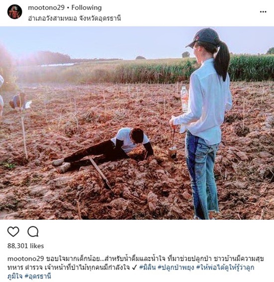 ทั้งนี้ โตโน่ ณิชา ได้มาลงแรงช่วยกันปลูกป่าพร้อมกับชาวบ้านด้วย และก็มีภาพโมเมนต์น่ารัก ๆ มาฝากให้แฟน ๆ ได้ติดตามกันเช่นเคย โดยล่าสุด (20 ตุลาคม 2560) ก็ได้ลงภาพคู่จากงานดังกล่าว ขอบคุณฝ่ายหญิง ดังนี้