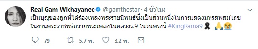 โดยล่าสุด (25 ตุลาคม 2560) แก้ม วิชญาณี ก็ได้เผยข้อความผ่านทวิตเตอร์ เกี่ยวกับการได้ทำหน้าที่ในครั้งนี้ว่า "เป็นบุญของลูกที่ได้ร้องเพลงพระราชนิพนธ์ซึ่งเป็นส่วนหนึ่งในการแสดงมหรสพสมโภชในงานพระราชพิธีถวายพระเพลิงในหลวง ร.9 ในวันพรุ่งนี้ #KingRama9"