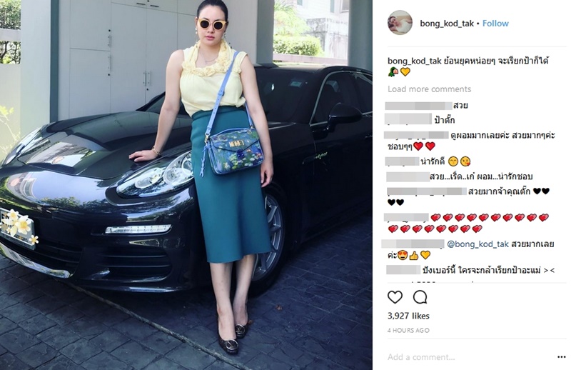 อย่างล่าสุด (2 พฤศจิกายน 2560) สาวตั๊กได้ใส่ชุดสไตล์วินเทจ ถ่ายคู่กับรถสีดำคันงาม พร้อมกับบอกว่า วันนี้แต่งตัวย้อนยุคหน่อย ๆ จะเรียกป้าก็ได้ แต่ดูเหมือนชาวเน็ตจะไม่สนใจชุดของสาวตั๊กสักเท่าไร เพราะกำลังตาลุกวาวอยู่กับรถ Porsche Panamera 2017 คันงามที่จอดเป็นแบ็คกราวนด์อยู่ด้านหลัง บอกเลยมันช่างโดดเด่นเอามาก ๆ ซึ่งราคารถยนต์รุ่นนี้เริ่มต้นที่ 9.8 ล้านบาท