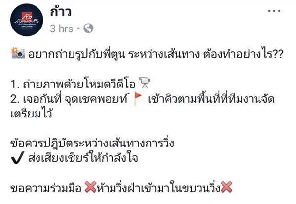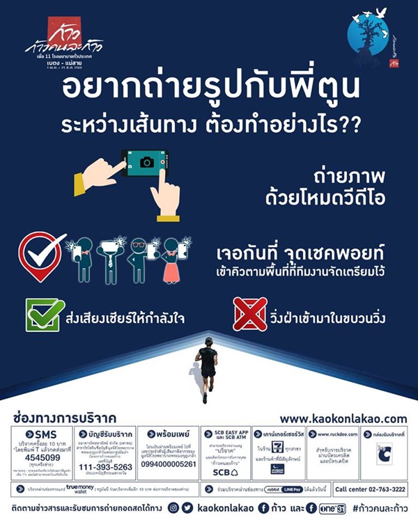สำหรับใครที่ต้องการถ่ายรูปกับหนุ่มตูนนั้น ทางเพจแนะนำให้อัดคลิปวิดีโอเอาไว้แทน และขอความกรุณาอย่าฝ่าเข้ามาในขบวนวิ่ง ให้ยืนรอตรงจุดที่จัดเอาไว้ให้ และสิ่งที่สำคัญที่สุดก็คือ อย่าลืมส่งเสียงเชียร์ให้กำลังใจหนุ่มตูน เพราะมันมีความหมายอย่างยิ่งและช่วยให้ไม่ท้อถอย ฮึดสู้ต่อไปได้จนจบนั่นเอง