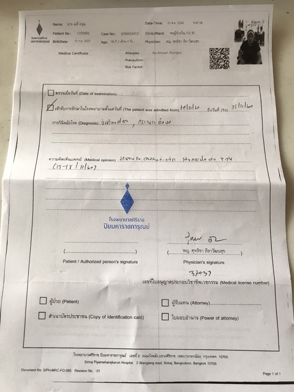 ทั้งนี้สำหรับผลการตรวจ แพทย์วินิจฉัยว่าอาการเหนื่อยและหมดแรงน่าจะมาจากอาการน้ำในหูไม่เท่ากัน กระเพาะอาหารอักเสบ และร่างกายอ่อนเพลียสะสมจากการทำงานหนัก ถ้าได้พักคงจะดีขึ้น คุณหมอจึงเห็นสมควรให้หยุดพักงานตั้งแต่วันที่ 15-18 พฤศจิกายน 2560