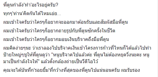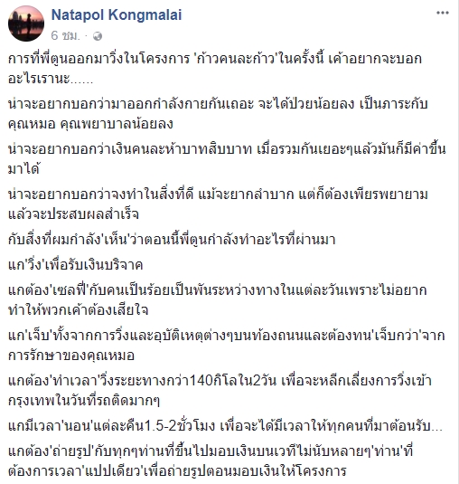 แกวิ่งเพื่อรับเงินบริจาค แกต้องเซลฟี่กับคนเป็นร้อยเป็นพันระหว่างทางในแต่ละวัน เพราะไม่อยากทำให้พวกเค้าต้องเสียใจ แกเจ็บทั้งจากการวิ่งและอุบัติเหตุต่าง ๆ บนท้องถนนและต้องทนเจ็บกว่าจากการรักษาของคุณหมอ แกต้องทำเวลาวิ่งระยะทางกว่า 140 กิโล ใน 2 วัน เพื่อจะหลีกเลี่ยงการวิ่งเข้ากรุงเทพฯ ในวันที่รถติดมาก ๆ แกมีเวลานอนแค่คืนละ 1.5-2 ชั่วโมง เพื่อจะได้มีเวลาให้ทุกคนที่มาต้อนรับ แกต้องถ่ายรูปกับทุก ๆ ท่านที่ขึ้นไปมอบเงินบนเวทีไม่นับหลาย ๆ ท่านที่ต้องการเวลาแป๊บเดียวเพื่อถ่ายรูปตอนมอบเงินให้โครงการ