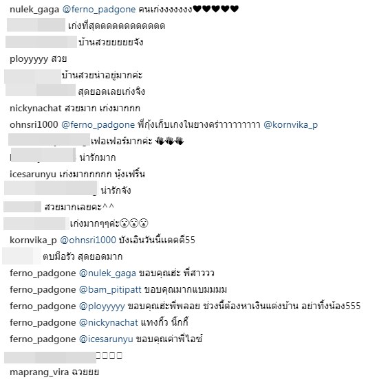 งานนี้ก็มีพี่ ๆ เพื่อน ๆ ในวงการบันเทิง เข้ามาคอมเมนต์ชมกันเพียบ ว่าสาวใบเฟิร์นเก่งมาก ๆ ที่สามารถซื้อบ้านให้คุณแม่ได้สำเร็จ บ้างก็ชมว่าบ้านสวยมาก ซึ่งเจ้าตัวก็เผยด้วยว่า ช่วงนี้ต้องหาเงินแต่งบ้านต่อ