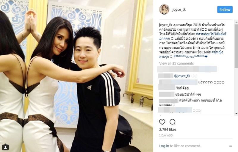 ล่าสุด (31 ธันวาคม 2560) จอยซ์ TK ก็ได้สร้างความฮือฮาให้กับบรรดาแฟนคลับไม่น้อย เมื่อเธอได้ออกมาโพสต์สุดสวีทกับหวานใจ เน้ง พัชนี เติมวิวัฒน์ ที่ได้มาเติมเต็มทำให้โลกของเธอเป็นสีชมพูอีกครั้ง โดยจอยส์ได้ถ่ายรูปคู่สุดหวานลงอินสตาแกรมส่วนตัว พร้อมกับแคปชั่นเผยเคล็ดลับขำ ๆ สำหรับสาวสาว ๆ ยุคใหม่ในปี 2018 นี้ ที่อ่านแล้วต้องยิ้มไปตามกัน