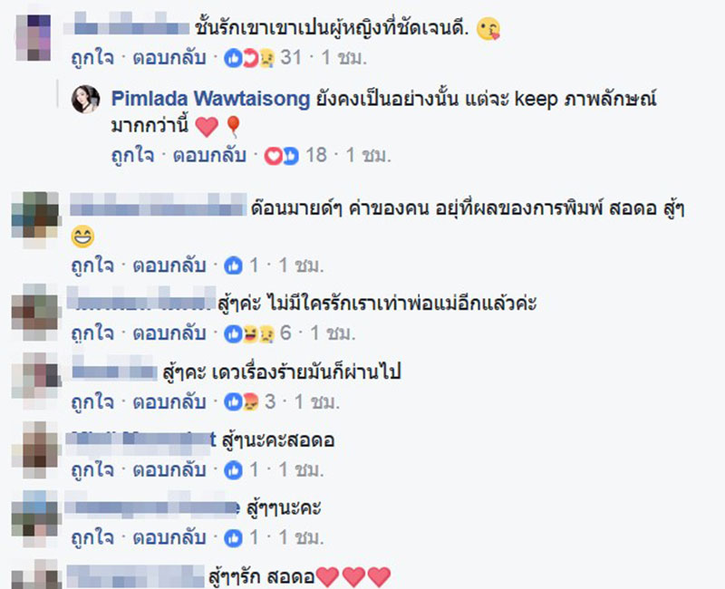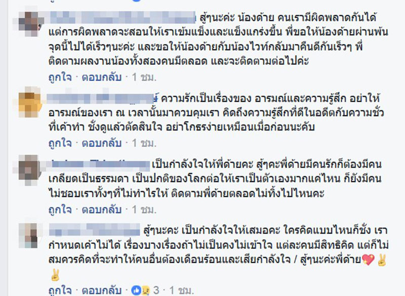 สุดท้ายเรื่องความรู้สึกของด้ายกับไวท์ ยังไงก็ขอให้มันค่อย ๆ เป็นไป ความรักสำหรับเราบางทีมันมีเรื่องของความรับผิดชอบและอะไรหลาย ๆ อย่างเข้ามาผสมปนกัน อะไรจะเกิดในวันข้างหน้าเราก็ไม่รู้ แต่ที่รู้กันอยู่ตอนนี้คือ เรายังคงต้องทำหน้าที่ของเรา ป.ล. การโดนรีทวีตด่าจนขึ้นอันดับหนึ่งมันสอนอะไรให้ด้ายหลายอย่างจริง ๆ ขอบคุณค่ะ"