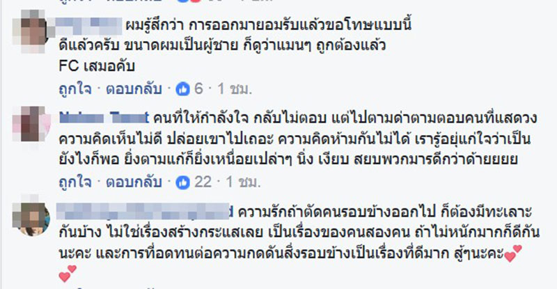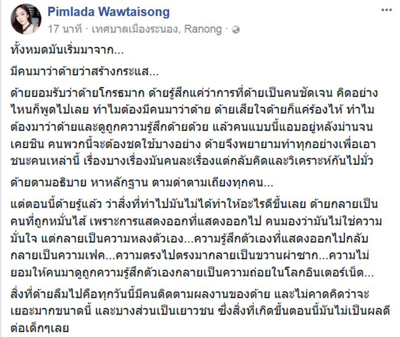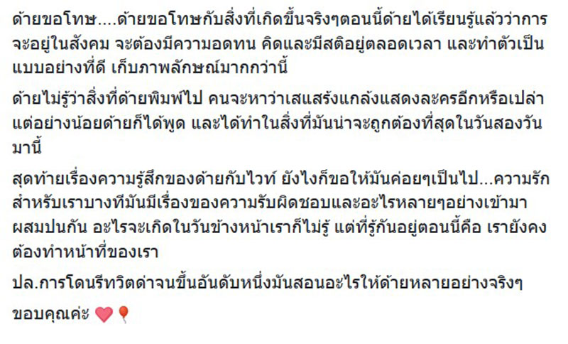 ด้ายขอโทษ ด้ายขอโทษกับสิ่งที่เกิดขึ้นจริง ๆ ตอนนี้ด้ายได้เรียนรู้แล้วว่าการจะอยู่ในสังคม จะต้องมีความอดทน คิดและมีสติอยู่ตลอดเวลา และทำตัวเป็นแบบอย่างที่ดี เก็บภาพลักษณ์มากกว่านี้ ด้ายไม่รู้ว่าสิ่งที่ด้ายพิมพ์ไป คนจะหาว่าเสแสร้งแกล้งแสดงละครอีกหรือเปล่า แต่อย่างน้อยด้ายก็ได้พูด และได้ทำในสิ่งที่มันน่าจะถูกต้องที่สุดในวันสองวันมานี้