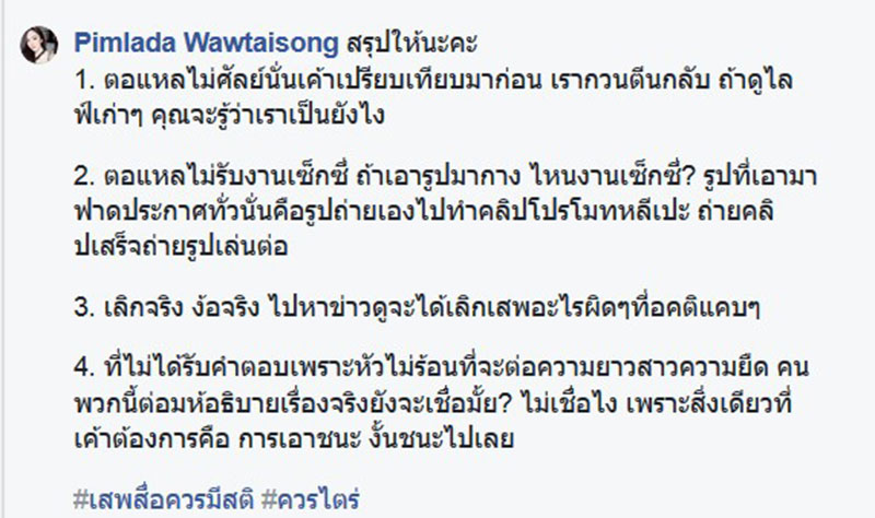 และล่าสุด (4 มกราคม 2561) เส้นด้าย ก็ได้ออกมาโพสต์ข้อความผ่านเฟซบุ๊กส่วนตัว Pimlada Wawtaisong ขอโทษหลังโดนแหกหนักมากในทวิตเตอร์ ระบุว่า...