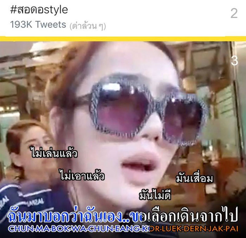 นอกจากนี้เธอยังสมัครแอคเคาท์ทวิตเตอร์ @sordorstylez เพื่อมาเปิดศึกกับชาวทวิตเตอร์โดยเฉพาะ ตามซัดคนที่โพสต์รำคาญคลิปและเพจของเธอ ทำเอาไฟในโลกนกสีฟ้าลุกโชน ออกมาแหกจับโป๊ะ เส้นด้าย สอดอstyle กันอย่างไม่เป็นท่าว่าย้อนแย้งไปไหมประกาศเลิกแฟนแต่ยังมีรูปคู่ปาร์ตี้ที่บ้านเมื่อวันที่ 3 มกราคม อยู่เลย...เธอสับสนอะไรหรือเปล่า รวมถึงการที่มีคนไปเจอเส้นด้าย กับแฟนอยู่ด้วยกันทั้งที่ประกาศเลิกไปแล้ว จนพี่ไวท์ต้องออกมาชี้แจงว่า ที่เห็น ๆ น่ะแค่มาทำงานด้วยกันเฉย ๆ !! แถมยังมีการขุดว่าเส้นด้ายสตรอว์เบอร์รีเรื่องศัลยกรรมด้วย ซึ่งเรื่องนี้เส้นด้ายก็ออกมาตอบเป็นข้อ ๆ ว่า