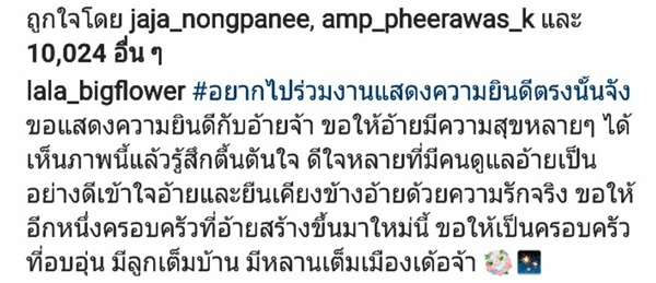 ขณะที่สาวลาล่า ก็โพสต์ข้อความลง IG ว่า "#อยากไปร่วมงานแสดงความยินดีตรงนั้นจัง ขอแสดงความยินดีกับอ้ายจ้า ขอให้อ้ายมีความสุขหลาย ๆ ได้เห็นภาพนี้แล้วรู้สึกตื้นตันใจ ดีใจหลายที่มีคนดูแลอ้ายเป็นอย่างดีเข้าใจอ้ายและยืนเคียงข้างอ้ายด้วยความรักจริง ขอให้อีกหนึ่งครอบครัวที่อ้ายสร้างขึ้นมาใหม่นี้ ขอให้เป็นครอบครัวที่อบอุ่น มีลูกเต็มบ้าน มีหลานเต็มเมืองเด้อจ้า"