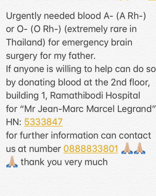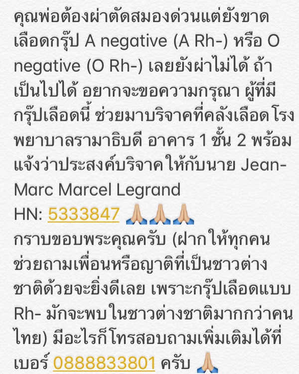 "ถ้าเป็นไปได้ อยากจะขอความกรุณา ผู้ที่มีกรุ๊ปเลือดนี้ ช่วยมาบริจาคเลือดที่คลังเลือดโรงพยาบาลรามาธิบดี อาคาร 1 ชั้น 2 โดยแจ้งว่าประสงค์บริจาคให้กับนาย Jean-Marc Marcel Legrand HN: 5333847 กราบขอบพระคุณครับ (ฝากให้ทุกคนช่วยถามเพื่อนหรือญาติที่เป็นชาวต่างชาติด้วยจะยิ่งดีเลย เพราะกรุ๊ปเลือดแบบ Rh- มักจะพบในชาวต่างชาติมากกว่าคนไทย)"