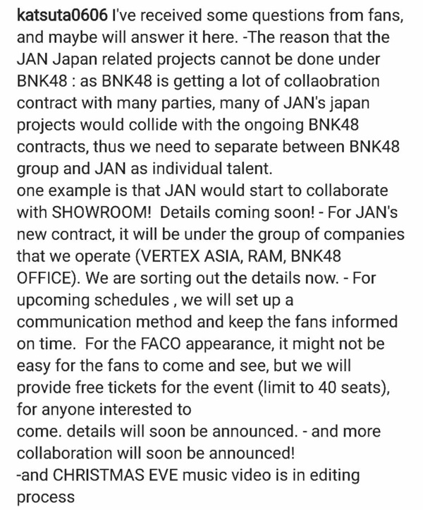 งานนี้ก็มีหลายคนที่สงสัยว่า หากมีโอกาสไปร่วมงานกับญี่ปุ่น ทำไม แจน ถึงต้องออกจากวง ใช้ชื่อ แจน BNK48 อย่างเดิมไม่ได้หรือ ซึ่งล่าสุด (30 มกราคม 2561) นายทาคาฮิโตะ คัตสึตะ หรือ มาร์คซัง International Director ของวง BNK48 ซึ่งช่วยประสานงานกับทางต่างประเทศให้กับน้อง ๆ ก็ได้ชี้แจงผ่าน IG เป็นภาษาอังกฤษ ซึ่งสรุปคร่าว ๆ ได้ดังนี้