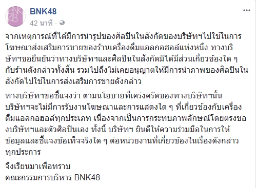 ล่าสุด (31 มกราคม 2561) คณะกรรมการบริหาร BNK48 ได้โพสต์ชี้แจงลงในเฟซบุ๊ก BNK48 ระบุว่า "จากเหตุการณ์ที่ได้มีการนำรูปของศิลปินในสังกัดของบริษัทไปใช้ในการโฆษณาส่งเสริมการขายของร้านเครื่องดื่มแอลกอฮอล์แห่งหนึ่ง ทางบริษัทขอยืนยันว่าทางบริษัทและศิลปินในสังกัดมิได้มีส่วนเกี่ยวข้องใด ๆ กับร้านดังกล่าวทั้งสิ้น รวมไปถึงไม่เคยอนุญาตให้มีการนำภาพของศิลปินในสังกัดไปใช้ในการส่งเสริมการขายดังกล่าว