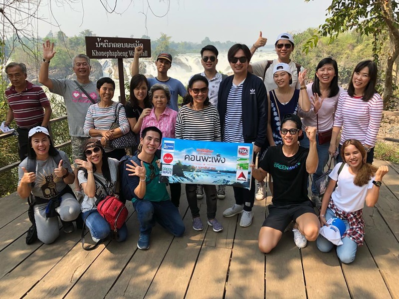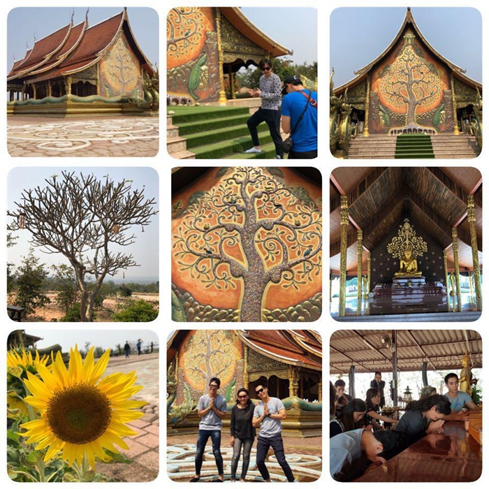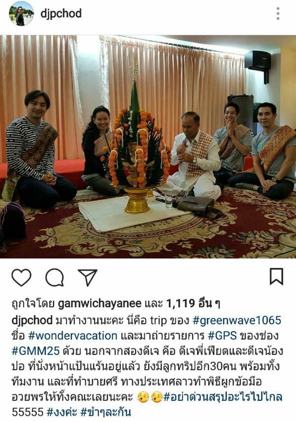 "มาทำงานนะคะ นี่คือ trip ของ #greenwave1065 ชื่อ #wondervacation และมาถ่ายรายการ #GPS ของช่อง #GMM25 ด้วย นอกจากสองดีเจ คือ ดีเจพี่เฟียตและดีเจน้องปอ ที่นั่งหน้าแป้นแร้นอยู่แล้ว ยังมีลูกทริปอีก 30 คน พร้อมทั้งทีมงาน และที่ทำบายศรี ทางประเทศลาวทำพิธีผูกข้อมืออวยพรให้ทั้งคณะเลยนะคะ #อย่าด่วนสรุปอะไรไปไกล 55555 #งงค่ะ #ขำๆละกัน"