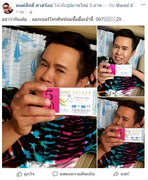 ถูกหวยติด ๆ กันมาหลายงวด แถมยังให้หวยแม่นจนหลายคนตามติด คอมเมนต์ขอเลขเด็ดกันรัว ๆ สำหรับนักร้องลูกทุ่งชื่อดัง มนต์สิทธิ์ คำสร้อย แต่ล่าสุดในงวดวันที่ 2 มีนาคม 2561 เลขที่ออกกลับไม่ตรงกับเลขที่เจ้าตัวโพสต์ลงเฟซบุ๊กเลย ทำเอาคอหวยเศร้าไปตาม ๆ กัน